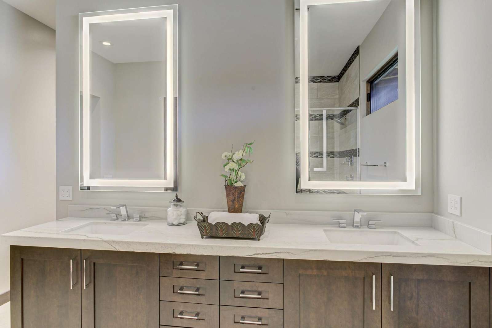 This 2,400 square foot home has a uniquely welcoming covered entry and foyer. Inside you’ll find an expansive great room featuring 12’ ceilings and expansive windows for a bright and airy feel. The well-appointed gourmet kitchen features a large center island with breakfast bar for informal dining, ample counter and cabinet space, and a uniquely hidden walk-in pantry. The private master suite features access to the covered patio, a generous walk-in closet plus master bath with dual-sink vanity, glass-enclosed shower, and private water closet. The en-suite junior master features a tiled shower and walk-in closet and is adjacent to a convenient laundry room.